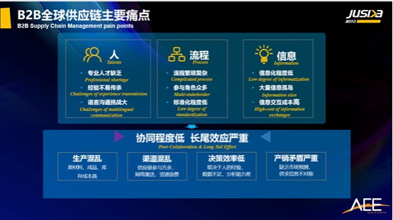 呂總在演講中詳細分析了當前B2B供應鏈管理面臨的新挑戰,他強調智能制造不斷發展的背景下,傳統的大規模定制已經很難滿足客戶的個性化要求,更加短鏈、高效、透明的供應鏈管理成為B2B供應鏈發展的趨勢所在。