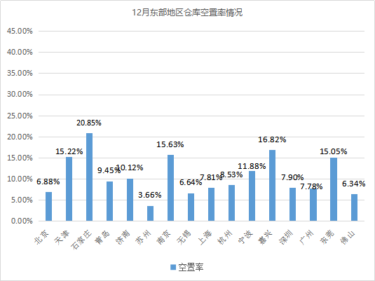 全國32個城市倉庫平均空置率為12.96%,環比上升0.02個百分點。其中,東北地區倉庫空置率(21.87%)遠高于西部(18.24%)、中部(13.32%)、東部(9.67%)地區。相較11月,東北、東部、西部、中部地區倉庫空置率相對穩定,升(降)幅變化在±1個百分點以內。
