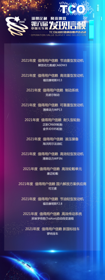 此外,發(fā)現(xiàn)信賴組委會還對制動系統(tǒng)、輪胎、輪轂、傳動系統(tǒng)等進行了評選,其中,采埃孚傳勝(TraXon)自動擋變速箱獲得2021年度值得用戶信賴高效傳動系統(tǒng);康邁輪轂獲得2021年度值得用戶信賴高效輪轂; 正新CR600輪胎獲得2021年度值得用戶信賴耐久型輪胎;海沃阿爾法油缸獲得2021年度值得用戶信賴液壓裝備,克諾爾制動系統(tǒng)獲得2021年度值得用戶信賴制動系統(tǒng)。此外,可蘭素還榮獲2021年度值得用戶信賴國六解放方案供應(yīng)商。