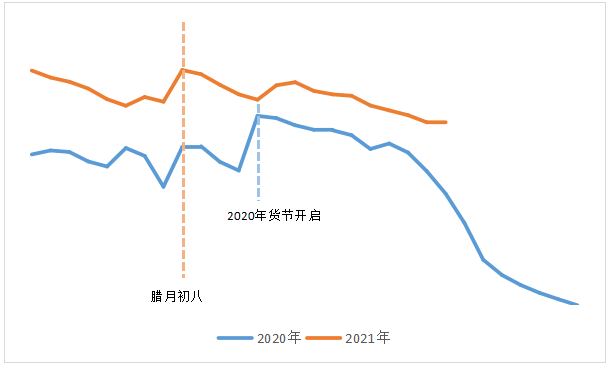 2020年及2021年農(nóng)歷“臘八”前后快遞量趨勢(shì)圖