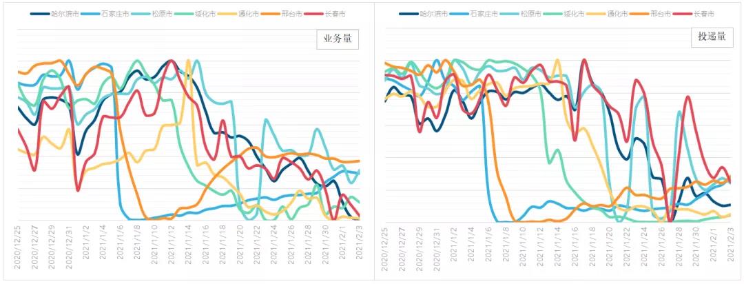 石家莊、邢臺(tái)、哈爾濱、綏化、長(zhǎng)春、松原、通化等受疫情影響的城市,快遞業(yè)務(wù)量恢復(fù)情況呈現(xiàn)不同狀態(tài)。通過(guò)對(duì)數(shù)據(jù)進(jìn)行分析我們發(fā)現(xiàn),相較于去年12月底,河北石家莊、邢臺(tái)兩市快遞量在1月6日左右出現(xiàn)斷崖式下降,14日左右逐步恢復(fù)。目前石家莊市業(yè)務(wù)量恢復(fù)約三成左右,邢臺(tái)業(yè)務(wù)量恢復(fù)約四成左右,長(zhǎng)春、哈爾濱基本恢復(fù)80%,綏化市恢復(fù)一成左右。投遞方面,長(zhǎng)春、哈爾濱、松原恢復(fù)情況基本和業(yè)務(wù)情況保持一致,通化、邢臺(tái)、石家莊、綏化受疫情管控因素及人員不足等因素影響,投遞量恢復(fù)情況弱于業(yè)務(wù)量恢復(fù)情況。