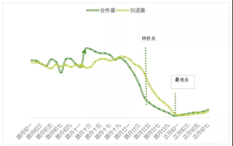 結(jié)合往年數(shù)據(jù),臘月二十四前后快遞量、投遞量出現(xiàn)轉(zhuǎn)折點(diǎn),呈急劇下降的情況,在除夕、大年初一迎來(lái)最低點(diǎn)。今年受多種因素影響轉(zhuǎn)折點(diǎn)或?qū)⒀雍螅汗?jié)前后最低點(diǎn)預(yù)計(jì)仍出現(xiàn)在除夕及大年初一,但整體仍呈均衡趨勢(shì),收寄時(shí)效將略受影響或?qū)⒌陀诋?dāng)前水平。