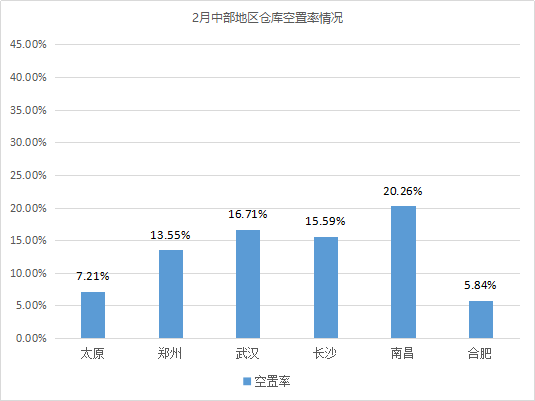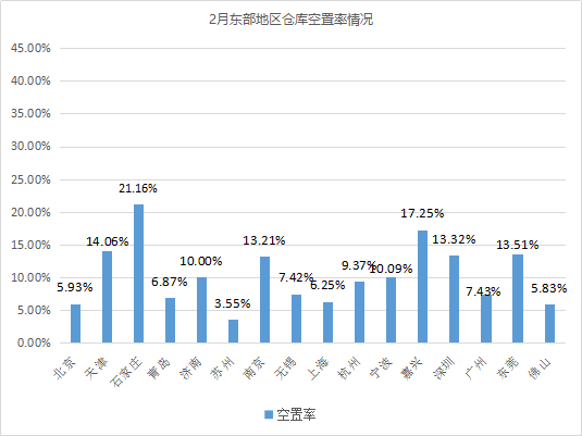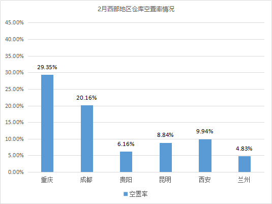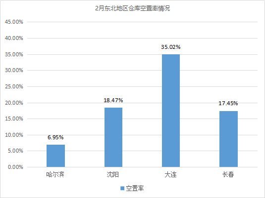 倉庫空置率較高的城市為大連、重慶,均高于25%。相較1月,大連、重慶倉庫空置率相對穩定,波動不大。