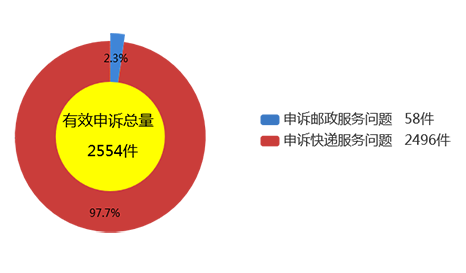 2.受理的申訴中有效申訴(確定企業責任的)為2554件,環比增長26.1%,同比增長12.7%。有效申訴中涉及郵政服務問題的58件,占有效申訴量的2.3%,環比下降6.5%,同比下降13.4%;涉及快遞服務問題的2496件,占有效申訴量的97.7%,環比增長27.1%,同比增長13.5%。