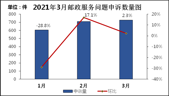 1.2021年3月,國家郵政局和各省(區、市)郵政管理局通過“12305”郵政業用戶申訴電話和申訴網站共處理申訴26605件,環比增長42.2%,同比增長61.6%。申訴中涉及郵政服務問題的727件,占總申訴量的2.7%,環比增長2.3%,同比下降11%;涉及快遞服務問題的25878件,占總申訴量的97.3%,環比增長43.7%,同比增長65.4%。郵政業業務量與去年同期相比增速較快,故申訴量同比增長明顯。
