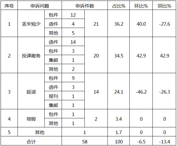 用戶對郵政服務問題有效申訴58件,環比下降6.5%,同比下降13.4%。郵政服務有效申訴的主要問題是郵件丟失短少、投遞服務和郵件延誤,分別占有效申訴總量的36.2%、34.5%和24.1%。其中,環比增長明顯的是投遞服務和快件丟失短少問題,同比增長明顯的是投遞服務問題。
