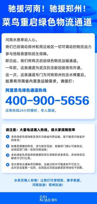 菜鳥今天宣布,將面向河南省內運輸啟動物流綠色通道,開展緊急救援運輸。該通道將首先保障搶險物資和民生緊急用品的運輸,一旦接下任務,將免費送達。河南省內各界有相關需要可以撥打菜鳥綠色通道熱線400-900-5656,該熱線24小時接聽,專人跟進。