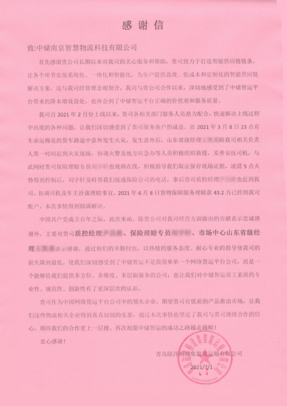 日前,一封來自青島陸洋暢通集裝箱運輸有限公司的感謝信,對網絡貨運平臺中儲智運在一起貨物自燃事故中,通過及時、專業的貨物保障服務挽回43.4萬元損失給予了高度評價。