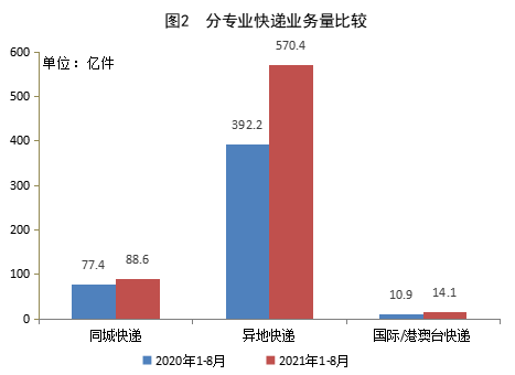 1-8月,全國快遞服務(wù)企業(yè)業(yè)務(wù)量累計完成673.2億件,同比增長40.1%;業(yè)務(wù)收入累計完成6509.4億元,同比增長23.4%。其中,同城業(yè)務(wù)量累計完成88.6億件,同比增長14.5%;異地業(yè)務(wù)量累計完成570.4億件,同比增長45.4%;國際/港澳臺業(yè)務(wù)量累計完成14.1億件,同比增長29.4%。