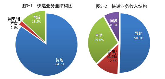 1-8月,同城、異地、國際/港澳臺快遞業(yè)務(wù)量分別占全部快遞業(yè)務(wù)量的13.2%、84.7%和2.1%;業(yè)務(wù)收入分別占全部快遞收入的8.1%、50.6%和12.4%。與去年同期相比,同城快遞業(yè)務(wù)量的比重下降2.9個百分點,異地快遞業(yè)務(wù)量的比重上升3.1個百分點,國際/港澳臺業(yè)務(wù)量的比重下降0.2個百分點。