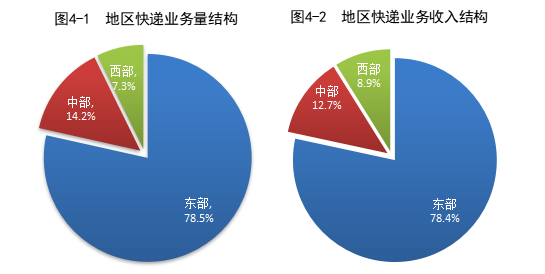 1-8月,東、中、西部地區(qū)快遞業(yè)務(wù)量比重分別為78.5%、14.2%和7.3%,業(yè)務(wù)收入比重分別為78.4%、12.7%和8.9%。與去年同期相比,東部地區(qū)快遞業(yè)務(wù)量比重下降1.4個百分點,快遞業(yè)務(wù)收入比重下降1.5個百分點;中部地區(qū)快遞業(yè)務(wù)量比重上升1.4個百分點,快遞業(yè)務(wù)收入比重上升1.1個百分點;西部地區(qū)快遞業(yè)務(wù)量比重基本持平,快遞業(yè)務(wù)收入比重上升0.4個百分點。