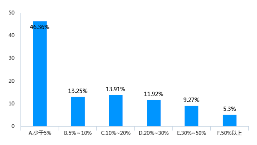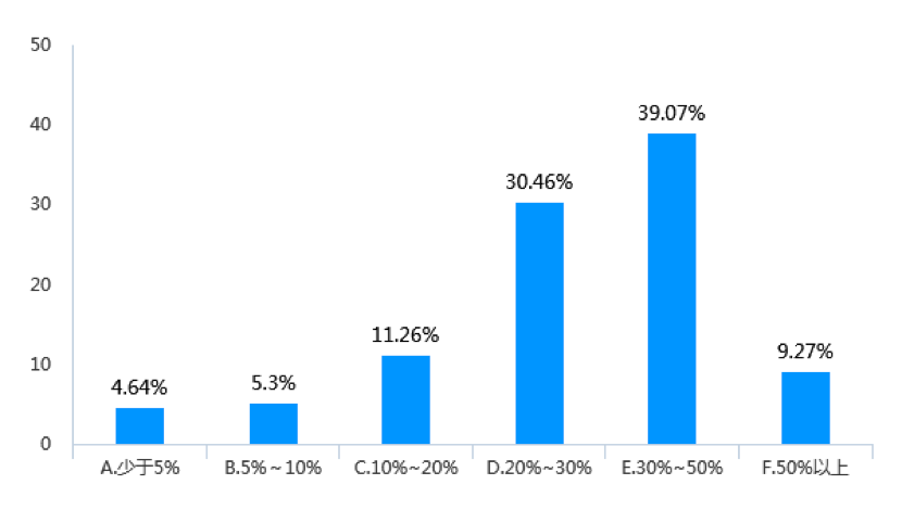 調(diào)查顯示,在21.58%的受調(diào)查企業(yè)中,中高層女管理者占比達(dá)到了30%~50%(見(jiàn)圖6);與此同時(shí),在20.53%的受調(diào)查企業(yè)中,中層女管理者占比為30%~50%(見(jiàn)圖7);此外,在46.36%的受調(diào)查企業(yè)中,副總級(jí)以上女高管少于5%;僅有9.27%的受調(diào)查企業(yè)副總級(jí)以上女高管占比達(dá)到30%~50%(見(jiàn)圖8)。