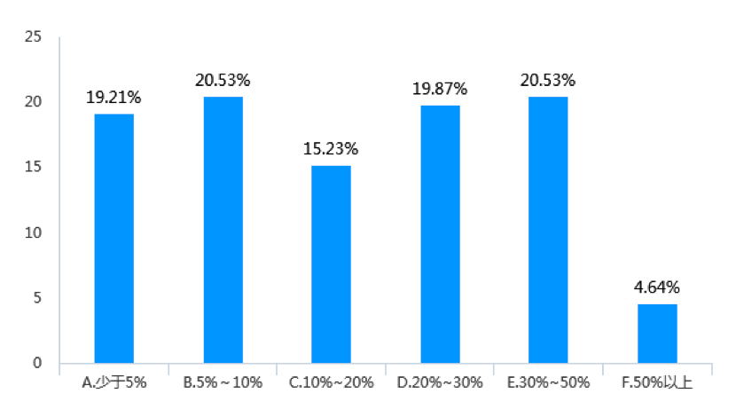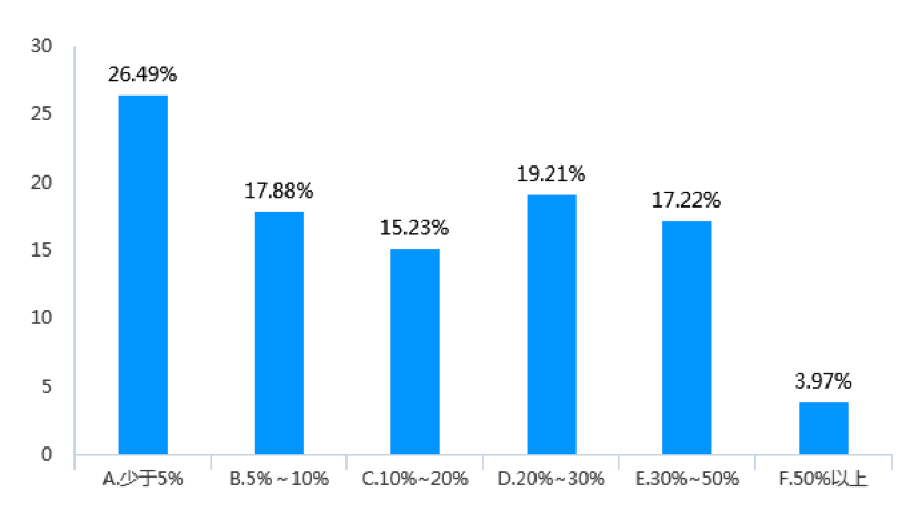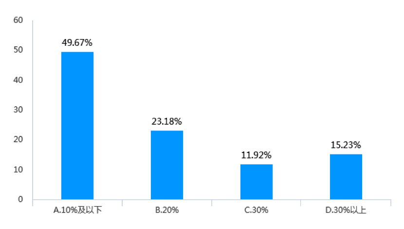 調(diào)查數(shù)據(jù)顯示,近三年來(lái),受調(diào)查企業(yè)女員工升職比例在30%以上的企業(yè)占比為21.19%(見(jiàn)圖9),而中高層女管理者進(jìn)一步升職比例在30%以上的企業(yè)數(shù)量下降為15.23%(見(jiàn)圖10)。同樣,受調(diào)查企業(yè)中,中高層女管理者繼續(xù)升職的比例少于10%的企業(yè)占到了49.67%,而基層女員工升職比例少于10%的企業(yè)則占44.37%。