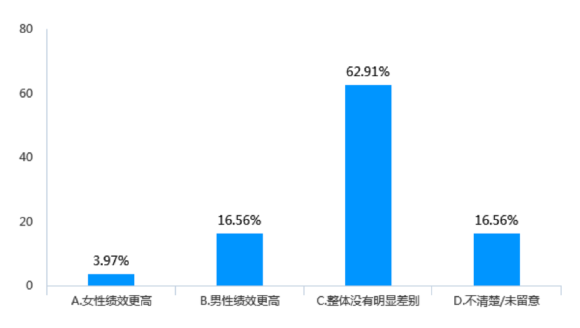 與薪資相對(duì)應(yīng),在工作績(jī)效方面,在受調(diào)查企業(yè)中,男女員工整體沒(méi)有明顯差別的企業(yè)占62.91%,認(rèn)為女員工整體績(jī)效更高的企業(yè)僅占3.97%,而認(rèn)為男員工績(jī)效更高的企業(yè)則有16.56%(見(jiàn)圖13)。