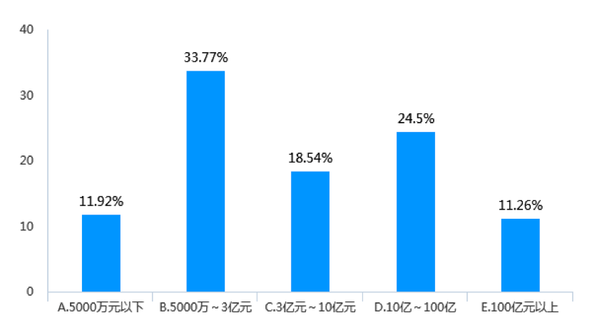 三是受調(diào)查企業(yè)規(guī)模占比最多的為中大型(見(jiàn)圖17)。具體而言,近三年平均主營(yíng)業(yè)務(wù)收入為5000萬(wàn)元~3億元的企業(yè)約占1/3,達(dá)到33.77%。