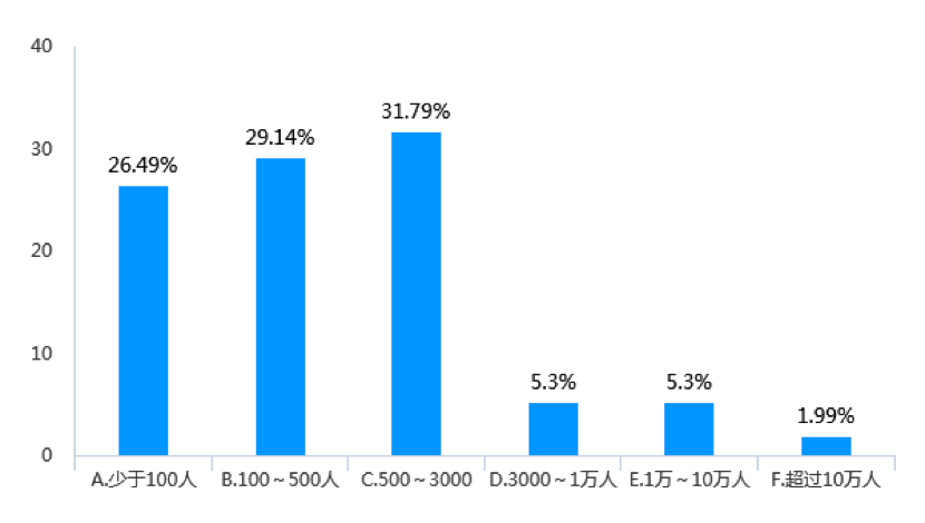 四是受調(diào)查企業(yè)的人數(shù)最多的是500~3000人(見(jiàn)圖18)。從近三年相關(guān)企業(yè)的平均員工人數(shù)看,人員為500~3000人的企業(yè)占31.79%;其次是100~500人的企業(yè)占比達(dá)29.14%;第三是少于100名員工的企業(yè)占比也達(dá)到26.49%。綜合而言,此次調(diào)查企業(yè)中,員工數(shù)為3000人以下的企業(yè)占比達(dá)87.42%,超過(guò)10萬(wàn)人的企業(yè)占比僅為1.99%。這與我國(guó)物流企業(yè)數(shù)量多、整體而言規(guī)模偏小的行業(yè)發(fā)展特點(diǎn)相符合。