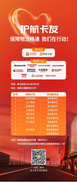 據了解,中國商用車龍頭企業中國重汽,攜手中汽兄弟,共同發起了“為卡友護航 助力物流暢通”的公益活動,在大廣高速、沈海高速、濰日高速、日蘭高速等路段的沿途共計10對服務區,設置了應急愛心物資發放點。自即日起至5月1日,凡持卡車駕駛證者,前往指定服務區,每日均可免費領取一份包括食品、生活用品以及新冠抗原檢測試劑盒等在內的愛心物資。中國重汽作為主辦方之一,為那些守護世界而勇毅前行的英雄們,送上實實在在的關愛與幫助。