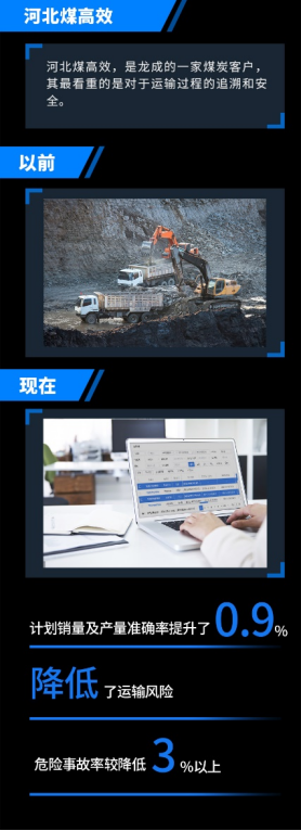 自平臺上線應用后,河北煤高效通過對發貨的實時監控,季度的計劃銷量及產量準確率提升了 0.9%,而且大大降低了運輸風險性和線下監管成本,危險事故率較以往降低了 3%以上。