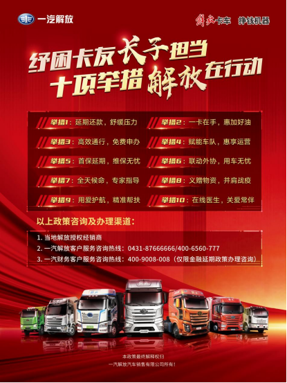 作為中國商用車領軍企業,“國車長子”一汽解放快速落實國家宏觀經濟政策,堅定不移履行央企政治責任、經濟責任、社會責任。圍繞客戶運營全場景,推出了“卡友紓困十項舉措”。當中,既有用戶最為關心的“6個月延期還本付息”金融支持;也不乏“惠好加油”“賦能車隊”的生態產品;還包含“首保延期”“專家指導”等多項解放感動服務;同時,卡友享有“義贈物資”“在線醫生”等貼心關懷。