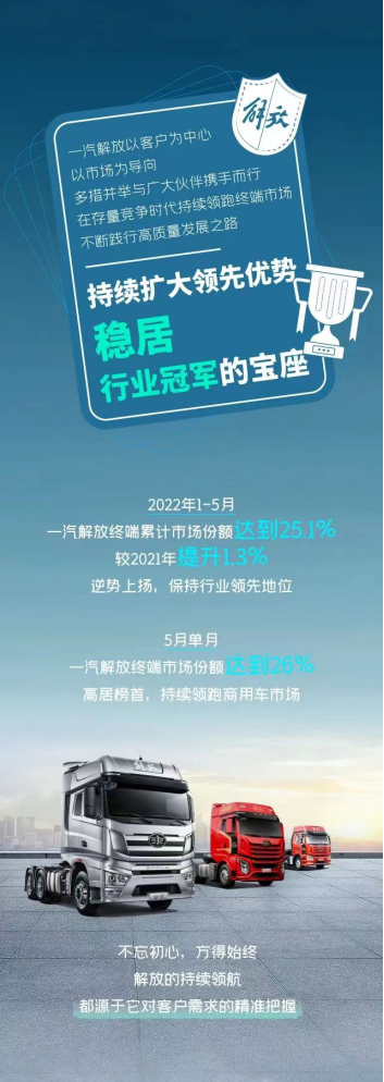 2022年1-5月,一汽解放終端累計市場份額達到25.1%,較2021年提升1.3%,逆勢上揚,保持行業領先地位;5月單月終端市場份額達到26%,隨著銷量的攀升,“雙料冠軍”一汽解放持續領跑商用車市場。