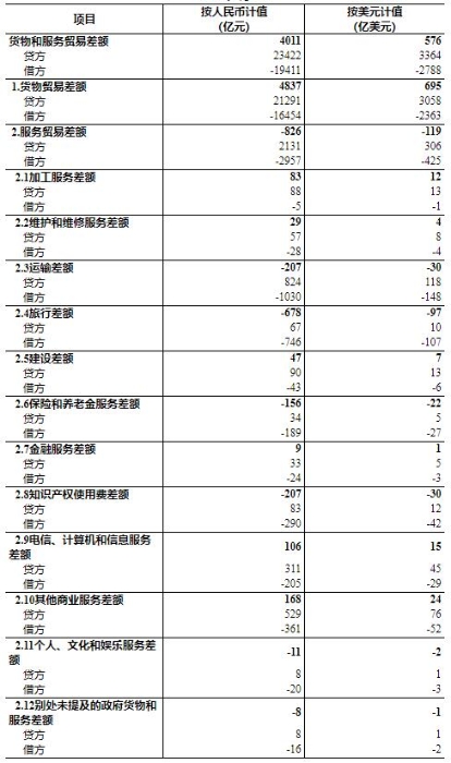 2. 國際收支貨物和服務貿易數據按美元編制,當月人民幣計值數據由美元數據按月均人民幣對美元中間價折算得到。