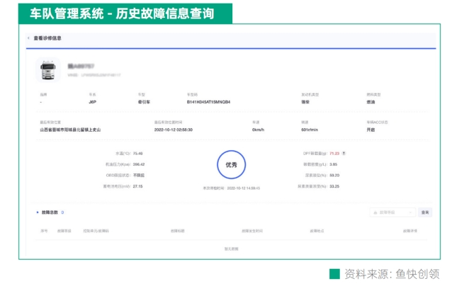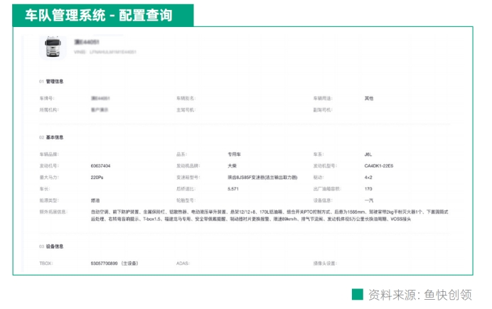 如何實(shí)現(xiàn)車隊“精細(xì)化管理”?以魚快創(chuàng)領(lǐng)為車隊提供的管理系統(tǒng)為例:車隊管理者在首頁輸入車牌號或者車架號后,即可在該頁面看到對應(yīng)車輛的基本配置,包括:駕駛室、發(fā)動機(jī)、變速箱、后橋、懸架、鞍座、后處理系統(tǒng)等。以上信息可幫助車隊管理者快速查并了解一臺車的相關(guān)配置。