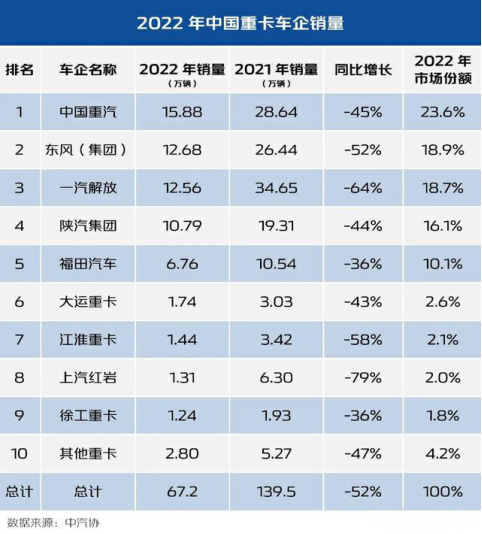 2022年,商用車市場受疫情反復、油價高企等多重因素影響,國內重卡市場整體銷量同比降幅達到52%。然而,中國重汽卻在行業市場下行的形勢下逆勢而上,以15.88萬輛的銷量、23.6%的市占率,勇奪2022年中國重卡行業銷量和市占率的“雙冠王”。