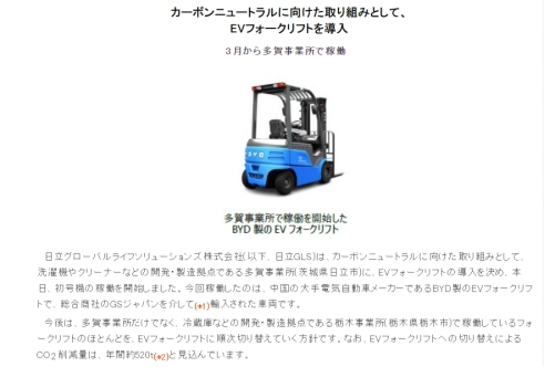 在開始運營當天,日立集團在官網(wǎng)發(fā)布了公告,并宣告今后不僅在多賀工廠,還將在櫪木工廠(冷庫車開發(fā)及生產(chǎn)基地)逐步引進電動叉車替代正在運行的汽油叉車的方針,這樣通過替換成電動叉車,預計每年可以減少約520噸二氧化碳的排放。