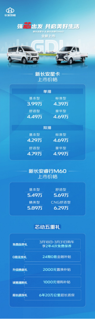 在創富者的矚目中,兩款新車正式上市。其中,新生代強動力微卡-新長安星卡官方指導價3.99萬元起,強動力寬體大微客-新長安睿行M60官方指導價5.49萬元起。