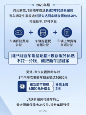 另外,當卡友置換新車時,解放給予原車輛因事故造成損失的一定金額補償,解決用戶的燃眉之急。3年內單次事故車損金額達10000元,每次即可獲得6000元補償金,補償上限為3次。值得注意的是,J7煥新服務還可隨車轉讓,最大限度保障了卡友權益,提升車輛殘值。