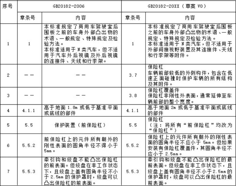 編制說明中指出,隨著汽車技術的發展,現代商用車設計的保險杠系統與標準GB 20182-2006起草時的經典保險杠有明顯的不同。目前大部分汽車保險杠不再是傳統的剛性保險杠,取而代之的是由蒙皮、吸能裝置和防撞梁組成保險杠系統。