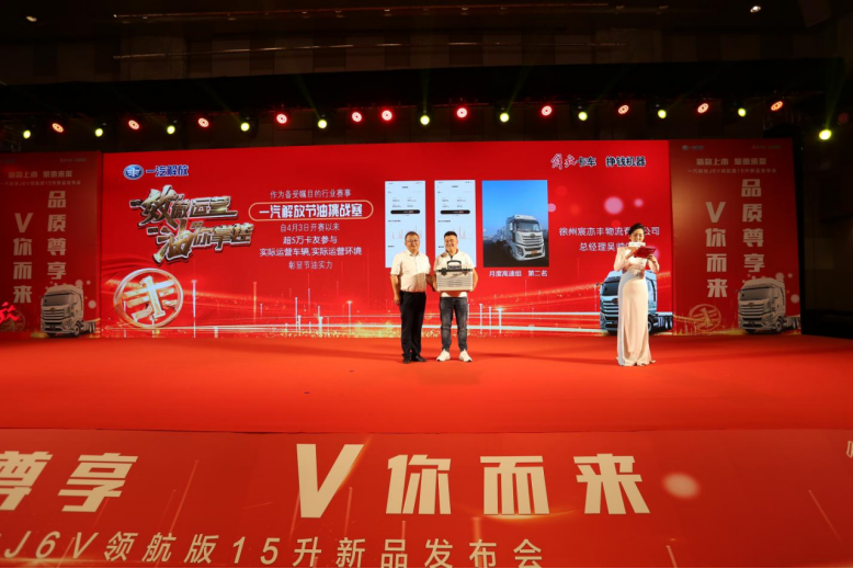 在發布活動現場,解放銷售公司江蘇商代處王念東經理為在一汽解放“效傲運營 油你掌控“節油挑戰賽中,榮獲一等獎的徐州卡友吳帥,頒發了大獎。節油挑戰賽成績的取得除了卡友優異的駕駛技術外,也離不開一汽解放車輛的優秀的節油性能。