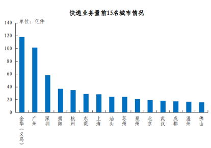 快遞業務量排名前十五位的城市依次是金華(義烏)、廣州、深圳、揭陽、杭州、東莞、上海、汕頭、蘇州、泉州、北京、武漢、成都、溫州和佛山,其快遞業務量合計占全部快遞業務量的比重達到51.1%。