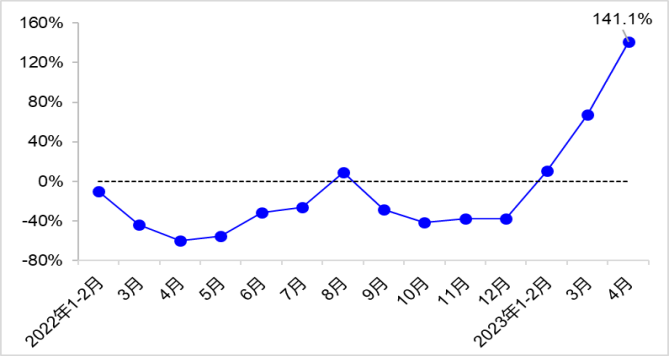 營業性客運量方面,4月完成營業性客運量7.8億人,同比增長141.1%。其中,完成公路客運量3.8億人,同比增長49.7%;完成水路客運量2176萬人,同比增長403.7%。1—4月,完成營業性客運量27.3億人,同比增長46.3%。其中,完成公路客運量13.6億人,同比增長11.2%;完成水路客運量7294萬人,同比增長136.9%。