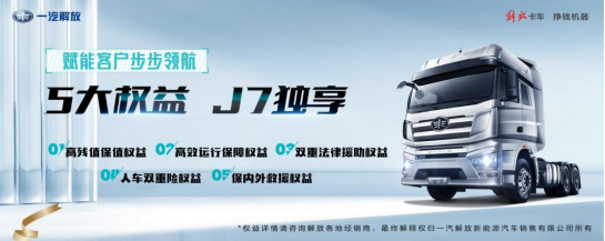 今年初春,解放重磅推出J7用戶專享的“五大權益”,行業首創從“人”“車”兩方面圍繞客戶運營場景、生活場景提供全方位的權益關懷。“五大權益”覆蓋“高殘值保值權益”“高效運行保障權益”“雙重法律援助權益”“人車雙重險權益”和“保內外救援權益”方方面面。不僅圍繞客戶真實需求提供主動關懷和服務,賦能客戶步步領航,也為國內高端商用車服務樹立了行業標桿。