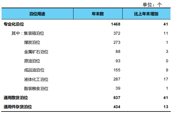 年末全國港口生產(chǎn)用碼頭泊位21323個,比上年末增加456個。其中,沿海港口生產(chǎn)用碼頭泊位5441個、增加22個,內(nèi)河港口生產(chǎn)用碼頭泊位15882個、增加434個。