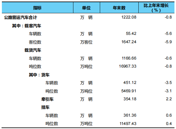 年末全國擁有公路營運汽車1222.08萬輛。分結構看,擁有載客汽車55.42萬輛、1647.24萬客位,比上年末分別減少3.28萬輛、103.79萬客位;擁有載貨汽車1166.66萬輛、16967.33萬噸位,分別減少6.60萬輛、132.17萬噸位,其中,普通貨車387.69萬輛、4716.19萬噸位,分別減少19.25萬輛、207.24萬噸位,專用貨車63.43萬輛、753.72萬噸位,分別增加3.05萬輛、34.96萬噸位,牽引車354.18萬輛、增加7.50萬輛,掛車361.36萬輛、增加2.11萬輛。