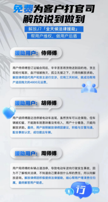 法律難題解放來管,維權之路守護兼程。2023年3月,解放行APP J7用戶專屬權益【法律援助】正式上線,知名律師在線答疑,幫助司機解決運輸過程中遇到的法律難題,為卡友節省維權所需的時間和經濟成本。此外,一汽解放還積極打造安全共管服務,用誠意幫助卡車司機降低理賠的成本。