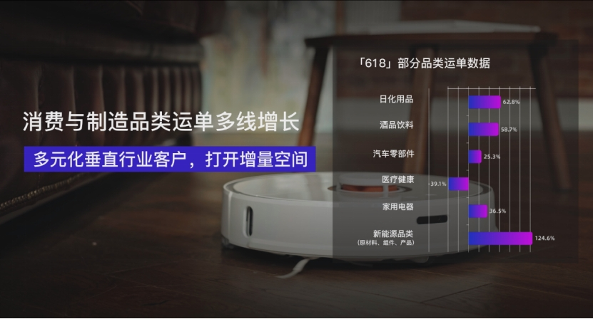 福佑卡車發布的數據顯示,“618”期間,平臺新能源類(原材料、組件、產品)運單呈現強勁增長態勢,較往年同期增長124.6%,日化用品、酒品飲料、家用電器等熱門品類也增勢不減,運單量分別同比增長62.8%、58.7%、36.5%。此外,汽車零部件類運單的增速也達到了25.3%。