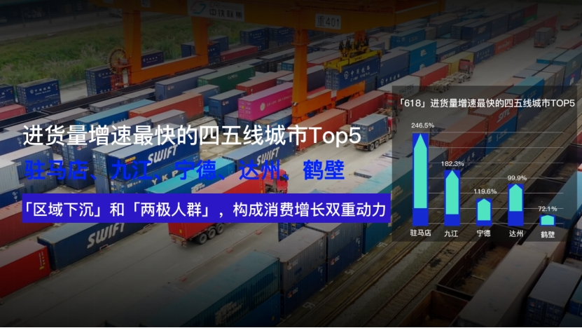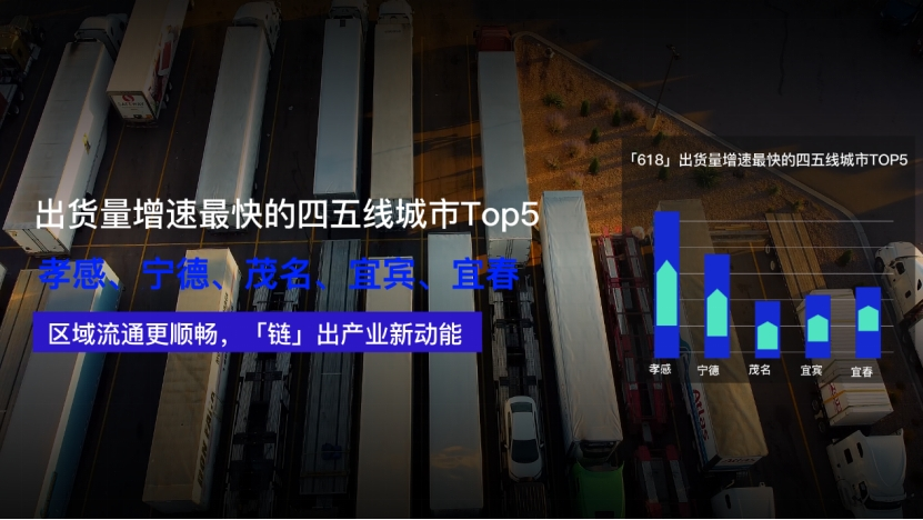 值得一提的是, “618”大促期間,三四線城市及縣鎮等下沉市場消費潛力加速釋放,進出貨量呈現出較高增速。福佑卡車發布的數據顯示,孝感、寧德、茂名、宜賓、宜春位列出貨量增速最快的top5城市,駐馬店、九江、寧德、達州、鶴壁位列進貨量增速最快的top5城市。