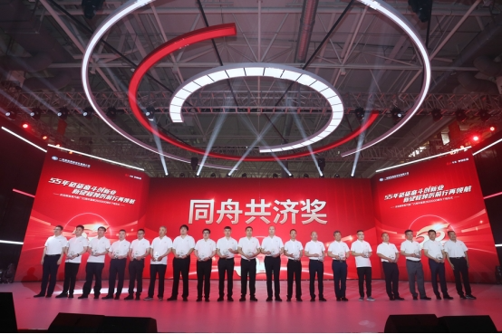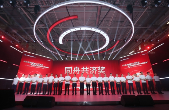 “祝解放青汽生日快樂!希望繼續與青汽公司同舟共濟、攜手共贏!”“祝愿青汽公司在未來的發展中一路領先、揚帆領航!”“55載風華正茂,55年碩果累累,祝福青汽事業蒸蒸日上,興旺發達”——來自用戶、供應商、經銷商、兄弟單位、退休員工和青汽員工飽含深情的祝福視頻點燃了現場的熱烈氣氛。一汽解放青島整車事業部黨委副書記、紀委書記、工會主席王立君宣讀了“天道酬勤”、“同舟共濟”、“功勛經銷商”等獎項的表彰決定。一汽解放和解放青汽領導班子成員登臺,為獲獎單位和人員代表頒獎。沉甸甸的獎杯、無上的榮耀,激勵著解放青汽人與廣大合作伙伴,和衷共濟,比肩同行,共同奔赴更加美好的未來!
