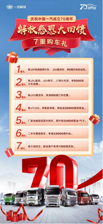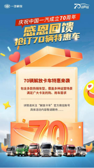 為獻禮中國一汽70周年華誕,感恩用戶厚愛,一汽解放近期特別推出包括超低首付購車、二手車置換優(yōu)惠等在內(nèi)的“七重禮”回饋廣大卡友;同時,解放品牌共計70輛“特惠車”即將在線上搶購;近期到店用戶,還將有機會享70周年“進店禮”……諸多精彩內(nèi)容就在當下,不容錯過!