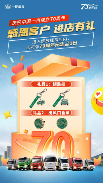 隨著70周年慶祝活動的升溫,近期到解放經(jīng)銷商店內(nèi)的用戶將收獲“一汽70周年紀念品”一份。
