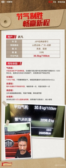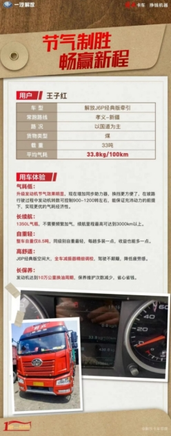 王子紅是一名經驗豐富的卡車司機,他新購入的解放J6P經典版LNG牽引車,動力強勁,加速迅猛,讓他豎起大拇指,頻頻稱贊。他駕駛著這臺車來往于山西孝義和新疆一帶運煤,線路以國道為主。日常載重約33噸,平均氣耗為33.8kg/100km。超低的氣耗得益于解放全新升級的發動機,在坡路行駛過程中,發動機轉數可控制在900-1200轉左右,能夠保證充沛動力的前提下,實現更優的氣耗經濟性。