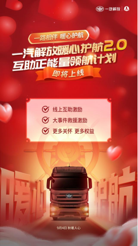 2023年9月4 日,“一汽解放暖心護航2.0——互助正能量領航計劃”正式上線,同步在“卡友地帶”設立解放品牌互助專區,為卡友提供線上、線下一體的救助幫扶。初心不變,關愛升級,雙向奔赴,為你而來!
