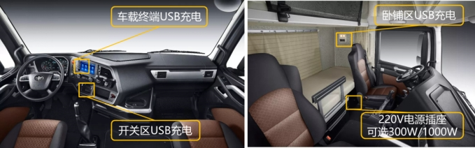 車門兩道密封,變速操縱,前圍等處均采用密封措施,使駕駛室密閉性、室內噪聲達到國際標準。整車內飾配置做到“想用戶之所想”,儲物空間達1350L,收納方便。駕駛室內設6處不同位置的插座和接口,用戶充電不用愁。方向盤集成多功能開關,車載調節、接打電話、巡航控制,一應俱全。同時,配備了12.3寸全液晶儀表屏,車速、轉速、里程表、氣壓、電壓故障警告等各類信息顯示,一目了然。