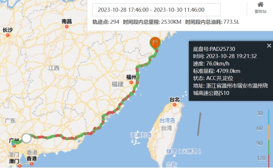 本次共進行了兩次體驗——第一次10月26日晚從溫州出發,10月27日抵達廣州,甩掛運輸,最終于10月28日晚返回溫州卸貨,往返總里程2530公里,全程高速,部分上坡路況。