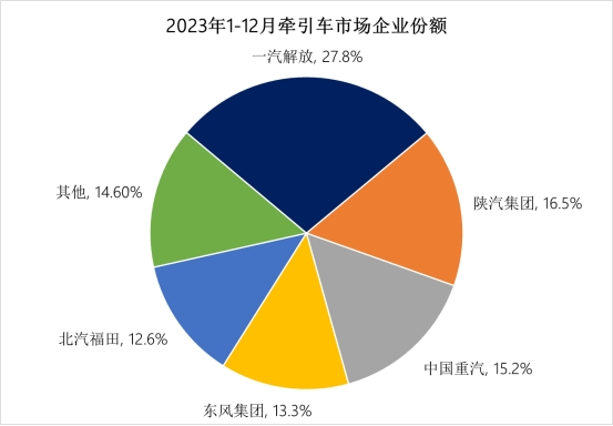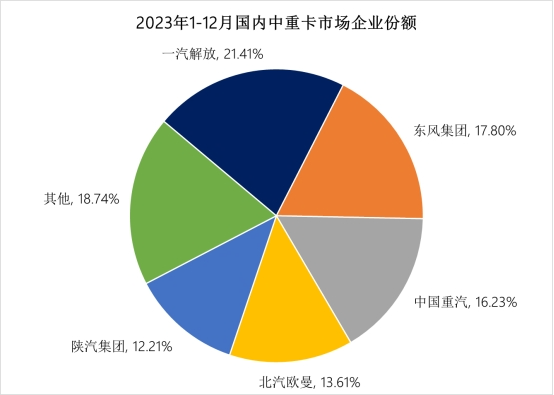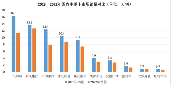 2023年的國(guó)內(nèi)中重卡市場(chǎng),是行業(yè)競(jìng)爭(zhēng)最為白熱化的“主陣地”,全年行業(yè)總銷量近77萬輛,同比增長(zhǎng)28.3%。市場(chǎng)份額占10%以上的頭部企業(yè)有五家,分別是:解放21.4%、東風(fēng)17.8%、重汽16.2%、歐曼13.6%和陜汽12.2%。前五強(qiáng)企業(yè)占據(jù)了行業(yè)80%以上的市場(chǎng)份額。