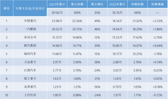 上表可見,在中重卡市場(chǎng)全年收獲超3成增長(zhǎng)的大環(huán)境下,絕大多數(shù)企業(yè)都同步實(shí)現(xiàn)了增長(zhǎng)。具體來看,2023年中重卡銷量前十家“累計(jì)增長(zhǎng)”9增1降,實(shí)現(xiàn)增長(zhǎng)的企業(yè)增幅均達(dá)到兩位數(shù),重汽、解放、陜汽、大運(yùn)和北奔等企業(yè)增幅高于中重卡市場(chǎng)整體33%的增幅,跑贏“大盤”,排名前兩位的重汽和解放中重卡銷量同比分別大增49%和46%,對(duì)2023年中重卡市場(chǎng)的增長(zhǎng)貢獻(xiàn)最大。