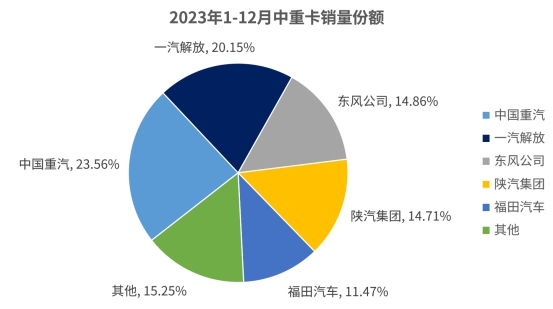 從市占率情況來看,2023年中重卡銷量前十企業(yè)合計(jì)份額達(dá)到96.12%,僅給排名靠后的企業(yè)留下不足5%的市場(chǎng)空間。其中,行業(yè)前五企業(yè)市場(chǎng)份額均超過10%,排名前兩位的重汽和解放市場(chǎng)份額均超20%,分別達(dá)到23.56%和20.15%。2023年,中重卡行業(yè)前五強(qiáng)合計(jì)分食了整個(gè)中重卡市場(chǎng)超80%的份額,領(lǐng)先優(yōu)勢(shì)巨大。